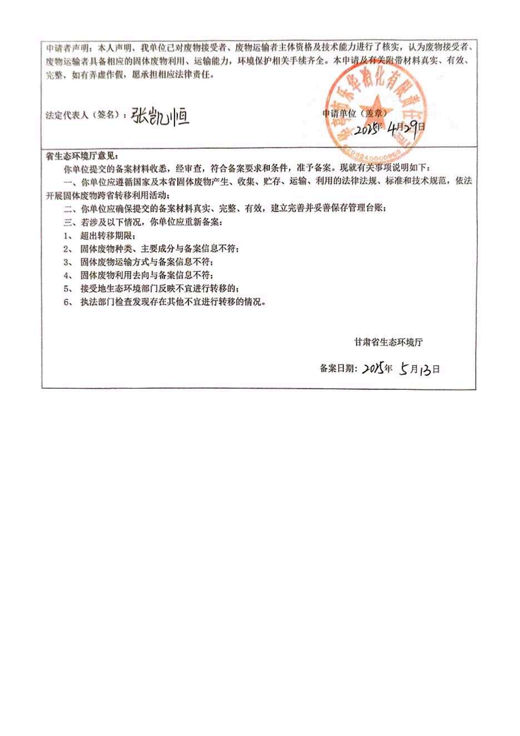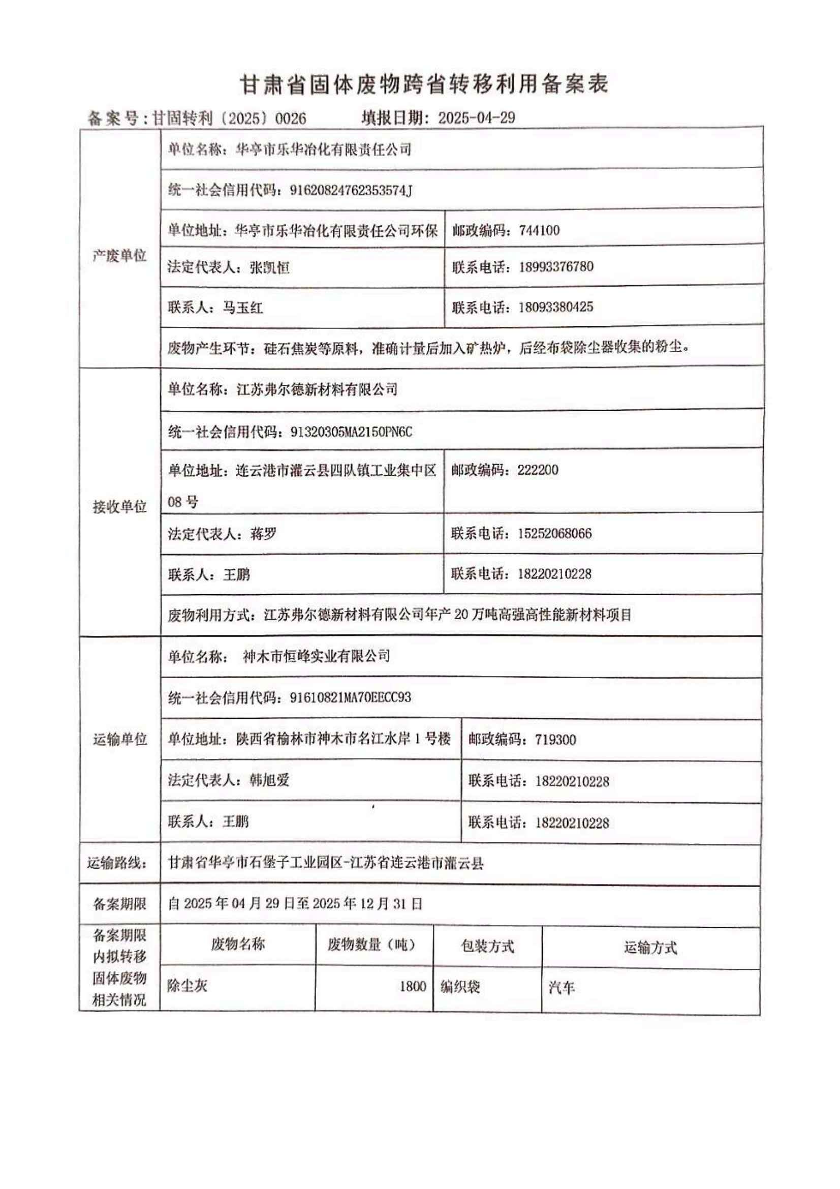 華亭市樂(lè)華冶化有限責(zé)任公司甘肅省固體廢物跨省轉(zhuǎn)移利用備案表